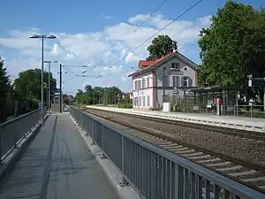 Deutsche Bundesbahn (DB), which was responsible for railway operations from 1949, assigned the station to the railway division of Mainz, which was responsible for all railway lines within the newly created state of Rhineland-Palatinate.[12] In the course of the staged dissolution of the railway division of Mainz from 1 August 1971, its counterpart in Karlsruhe took responsibility for the station.[13] In the meantime the station had been downgraded to a halt. The station became part of the Karlsruhe Stadtbahn in 2010. This was followed by the renewal of the platform.
