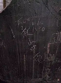 Side of the Soyuz TM-10 where it was signed by all its passengers. The inscription in Japanese reads Toyohiro Akiyama (秋山豊寛).
