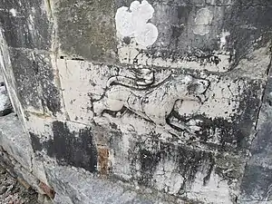 The temple walls contain several legendary icons including a lion, a serpent dragon with a knot in its tail, and a serpent dragon with its tail coiled around its neck and back.