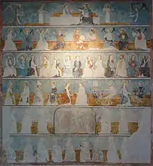 In much better shape than the lowest two bands of this mural are those of Saint Catherine of Alexandria and of a virgin (or the Virgin) with a unicorn.