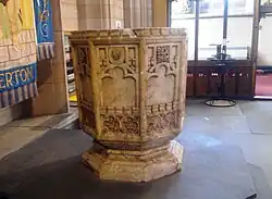 The interior is in Stourton stone with a Yorkshire stone floor. The nave has a hammerbeam roof. The arcades are carried on clustered piers. The former intricately carved chancel screen now acts as a reredos behind the altar at the east end of the nave. The stone pulpit, which contains marble panels with niches depicting scenes from the life of Christ in semi-relief, is a memorial to the Rt Revd James Fraser, Bishop of Manchester, who died in 1885. The octagonal font is in alabaster and is decorated with panels. Box pews, one of which is dated 1728, have been re-used as dado panelling in the vestry. In the nave are lamps designed by Peter Skinner. The stained glass in the east window, dated 1896, is by C. E. Kempe, and a window in the south aisle contains glass by Ward and Hughes dating from 1895. In another south aisle window is glass from 1922 by Edward Moore, which has been moved from the north chapel. The rest of the windows have been re-glazed after the 1991 fire with clear glass.[10] The two-manual pipe organ was built in 1967 by Hill, Norman and Beard,[14] replacing an earlier three-manual organ of 1888 by J. C. Bishop and Son.[15]