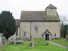 The nave formerly had a pair of porticus-style side chapels, but little trace of these remains—although blocked windows and fragments of archways and gabled roofs have been visible since 1918, when they were excavated.[3][11] The nave's dimensions are 43 by 22.5 feet (13.1 m × 6.9 m), and the walls are about 2.5 feet (0.76 m) thick.[10] The Norman doorway, reset on the north side in its 15th-century porch, have jambs with five stones of irregular length and a five-stone arch. The belfry, at the west end of the nave, sits on top of the roof with no structural link to the inside of the building. It has a shallow pyramid-shaped roof.[10]