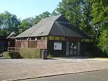 The entrance porch on the north wall was erected in the 15th century,[10] but the heavy oak door dates from the Norman era.[5][11] The entrance was originally on the south side; suggested reasons for its move include avoiding the prevailing wind, which blows off the hills straight into the south wall, or a change in the location of the nearby road in medieval times.[5] The squat wooden belfry at the west end of the nave is also 15th-century,[10] as are two of the three bells.[3] The path leading to the porch is unusually made of "ripplestone"—Horsham sandstone taken from a nearby riverbed.[5][11]