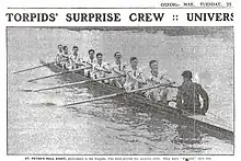 In the 1950s, the oarsmen of St Peter's Hall enjoyed significant success and their Hall had a strong reputation for sporting achievement.[13] The club entered up to six boats in each regatta. For the first time a St Peter's Torpid entered the First Division in 1950.[14] In 1955, the First Torpid went up 6 places, ending up as number 6 in the First Division (where they stayed for two years). In Eights Week the College's five boats achieved a total of eighteen bumps without being bumped with the First Boat ending up as number 1 in the Second Division.[15][16] Both finish results are now regarded as the highest achievements of a St Peter's First Torpid or First Eight.