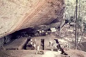 The excavation of the Stanfield-Worley Bluff Shelter commenced in 1960, after gaining approval of the property owner, Robert B. Stanfield. The project was under the guidance of the North Alabama Project, a partnership between the Alabama Archaeological Society, the University of Alabama and the Archaeological Research Association of Alabama.[3] The first two field seasons (1960 and 1961) were reported by David L. DeJarnette and colleagues.[5] The excavation of the third and final season (1963) was smaller in scale with the results never being published.