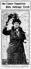 The torch accompanied activists and their speeches at several New Jersey cities.[1] At a meeting at the Atlantic Highlands on August 18, 1915, the torch was stolen from a car when it was under the care of Alyse Gregory.[17] Van Winkle offered a $50 reward for the return of the torch.[17][2] Blatch was critical of the New Jersey activists saying, "Mrs. H. O. Havemeyer and I, who guarded the torch in New York never let it out of our sight. We even took it to bed with us. I'm sorry the New Jersey suffragists were so recreant to their trust."[17] Immediately, anti-suffragists were blamed for being the thieves.[18][17] In order to counter the attack, anti-suffragists pledged $30 to increase the reward to $80 for the return of the torch.[2] The Suffrage Torch was found about a week later by a lawyer and suffragist, Anthony V. Lynch, Jr., who found it in a streetcar in Philadelphia.[2] Lynch refused the reward and gave the money back to the New Jersey suffragists.[2]