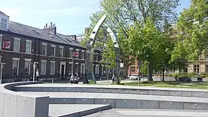 In 2007, the first redevelopment was completed; bringing the old Sunniside Gardens back to life with a complete makeover and a modern iconic sculpture to go along with it.[2] and the following year after that new bars and cafes in the area were opened, along with the new £6 million development arts centre, "ThePlace".[3][4]