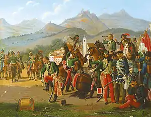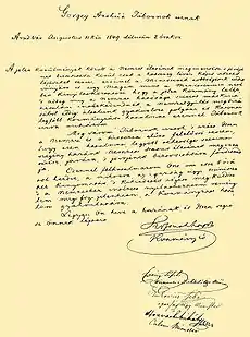 The Surrender at Világos, which was the formal end of the Hungarian Revolution of 1848, took place on 13 August 1849, at Világos, (now Șiria, Romania).[1] The terms were signed by Hungarian General Artúr Görgey on the rebels' side and Count Theodor von Rüdiger of the Russian Imperial Army. Following the capitulation, General Julius Jacob von Haynau was appointed Imperial plenipotentiary in the country and brutally re-subjugated it.