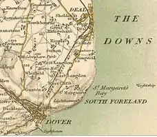 Sutton is a village and civil parish near Dover in Kent, England.[2] In 1935 this village became a parish when the small settlements of Studdal, Sutton, Ashley, Little Mongeham and Maydensole joined to become the Parish of Sutton-by-Dover. Prior to this Sutton has had a vast history of agricultural practices, which has helped sustain the village into the parish it is today.[3] The quoted population includes the villages of East and West Studdal plus Swingate and the hamlet of Little Mongeham.