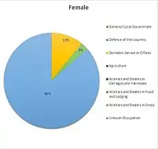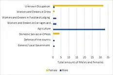 Furthermore, gender inequality also exists here, regarding the number of females working in this industry, as zero females were reportedly employed in this sector, compared to the 33 males which were. One reason for this was that in the 19th century, gender roles, which are structured around femininity and masculinity, were conceptions of what society deemed acceptable. As a result, gender inequality existed here, in that the role of a male in society was to provide for their family, typically engaging in work involving manual labour; whereas the role of a woman was oriented to the home, raising children and caring for the family. Evidence of this can be seen in the graph, as 86% of women in the village are in unknown occupations. The second most common occupation for women here is domestic services with four females working in this sector, suggesting that women worked as carers or nannies.[10]