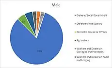 Furthermore, gender inequality also exists here, regarding the number of females working in this industry, as zero females were reportedly employed in this sector, compared to the 33 males which were. One reason for this was that in the 19th century, gender roles, which are structured around femininity and masculinity, were conceptions of what society deemed acceptable. As a result, gender inequality existed here, in that the role of a male in society was to provide for their family, typically engaging in work involving manual labour; whereas the role of a woman was oriented to the home, raising children and caring for the family. Evidence of this can be seen in the graph, as 86% of women in the village are in unknown occupations. The second most common occupation for women here is domestic services with four females working in this sector, suggesting that women worked as carers or nannies.[10]