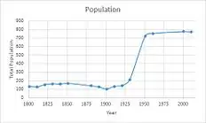 Since data collection began in 1801, population figures remained very similar between this year and 1931, whereby up until then there have been minimal increases and decreases in total population.[7] In 1801 the total population stood at 134 (65 males and 69 females) and after a century, these figures fluctuated very little, whereby in 1931 the total population was 212 with there being an even split of males and females. Over the duration of 130 years the total population increased by only 78, averaging an increase 0.6 people per year. However, between 1931 and 1951 the total population increased significantly, whereby over a 20-year period 511 people had moved into this area, which when compared to the statistical data from previous years is a substantial gain, which fails to fit the norm.