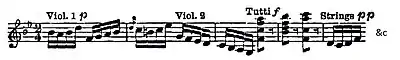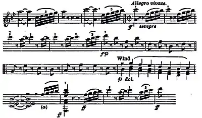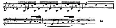 The second subject is, in the words of Donald Tovey, "a conversation between the bassoon, the oboe, and the flute."[17] The development section takes the tonality towards the remote key of B major before returning to the tonic B♭, and the recapitulation and coda follow the conventional classical form.[17]