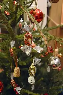 Szaloncukor (Slovak: salónka, plural salónky;[1] literally: "parlour candy", Romanian: bomboane de pom) is a type of sweet traditionally associated with Christmas in Hungary, Romania and Slovakia.[2] It is a typical imported and adapted Hungarikum. It is assumed that almost the whole quantity consumed in Romania are of Hungarian production, as Romanian chocolate production decreased substantially after the fall of communism. It is usually made of fondant, covered by chocolate and wrapped in shiny coloured foil, then hung on the Christmas tree as decoration.