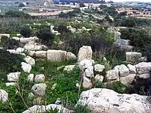 The area expropriated in 1881 lay contiguous to this lane, with the intention of creating public access to the site. As a fuel storage installation was built in Wied Dalam, the northern end of this lane was closed off by the installation. The site cannot be approached through this lane from the south.[5] The lane fell in disuse, a process encouraged by the dumping of refuse and building materials. This blocked off the lane at two different points. Two carob trees have grown across the lane, causing two further impassable points along its length.[5]