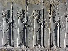 The Tachara is connected to the south court by a double reversed stairway. Later under the reign of Artaxerxes III, a new stairway was added to the northwest of the Tachara which is connected to the main hall through a new doorway. On walls of these stairways, there are sculptured representations of figures such as servants, attendants and soldiers dressed in Median and Persian costumes, as well as gift-bearing delegations flanking carved inscriptions.[2]