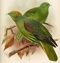 The Taiwan green pigeon is visually similar to the Wedge-tailed green pigeon,[4] but with usually darker plumage. Females are of various green shades throughout, and males have a distinctive purple-grey patch over the wings.