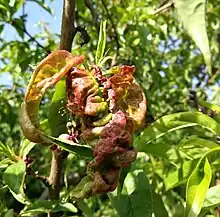 Taphrina deformans infects species of the genus Prunus (including P. amygdalus (almond) and P. persica (peach)).[5] It is best known as the causative agent of peach leaf curl in peaches and nectarines. It has been observed that this fungus also infects the fruits of some South American trees like Ocotea puberula, Nectandra megapotamica and other Lauraceae species. An additional form has been identified which infects apricots. Some researchers posit that these forms are separate varieties altogether, which is supported by recent genetic evidence based on hybridization. Furthermore, almond strains of T. deformans seem to be unable to induce peach leaf curl on peach trees, and vice versa.[2]