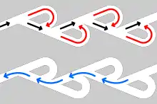 The upper figure shows flow in the blocking direction: at each segment, part of the fluid is turned around (red) and interferes with the forward flow (black).
