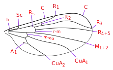 Adults are recognised by the seven veins reaching the margin, the costa running around the entire margin, the absence of ocelli, and particularly by the short antennae which are no longer than the head.