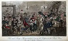 Many famous felons and highwaymen took the St Giles Bowl at the sign of the Angel, including John Cottington 'Mulsack' who picked Cromwell's pocket,[8] John Nevison 'Swift-Neck', and 'Handsome' Tom Cox who robbed the Kings Jester, Thomas Killgrew.[9] Perhaps the most famous scene to occur over the St Giles Bowl was the procession of the thief and popular hero 'Honest Jack' Sheppard to Tyburn, accompanied by as many as 200,000 citizens. According to one fictionalised telling, Sheppard refused the Bowl and instead pledged that his persecutor, the corrupt thief taker Jonathon Wild, would taste of the cup within six months. Six months later Wild was executed for theft at Tyburn.[10]