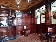 The interior is one of the best preserved historic Victorian public house interiors in London, with CAMRA cataloguing it as a 'A pub interior of outstanding national historic interest',[19] and features a number of working fireplaces, among many exquisite fittings and features, including decorative dark-wood panelling, polished brass, Victorian decorative glass, and a coffered and patterned plaster ceiling in the public bar.[19]