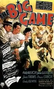 The Big Game is a 1936 American sports drama film directed by George Nicholls, Jr. and produced by RKO Radio Pictures, which released the film on October 9, 1936. The screenplay was written by Irwin Shaw, adapted from the 1936 novel of the same name by Francis Wallace. The film stars Philip Huston, James Gleason, June Travis, Bruce Cabot and Andy Devine. Huston (1908–1980) was a respected New York stage actor, who also had prominent roles in a number of motion pictures and, later, acted in television productions, as well.