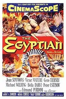 The Egyptian is a 1954 American epic historical drama film made by 20th Century Fox. Filmed in CinemaScope with color by DeLuxe, it was directed by Michael Curtiz and produced by Darryl F. Zanuck. It is based on Mika Waltari's 1945 novel of the same name and the screenplay was adapted by Philip Dunne and Casey Robinson. Leading roles were played by Edmund Purdom, Bella Darvi, Jean Simmons, Victor Mature, Gene Tierney, Peter Ustinov, and Michael Wilding. Cinematographer Leon Shamroy was nominated for an Oscar in 1955.
