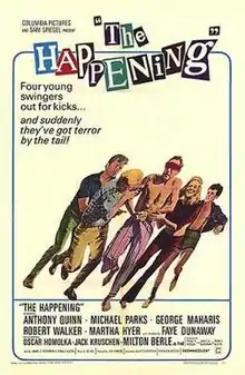 The Happening is a 1967 American crime comedy film directed by Elliot Silverstein, and starring Anthony Quinn, Michael Parks, George Maharis, Robert Walker Jr., Martha Hyer, and Faye Dunaway. It tells the story of four hippies, who kidnap a retired Mafia mob boss, holding him for ransom.