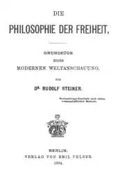 The Philosophy of Freedom is the fundamental philosophical work of philosopher, Goethe scholar and esotericist Rudolf Steiner (1861–1925).[1] It addresses the question of whether and in what sense human beings are free. Originally published in 1894 in German as Die Philosophie der Freiheit,[2][3] with a second edition published in 1918, the work has appeared under a number of English titles, including The Philosophy of Spiritual Activity (the title Steiner proposed for the English-language translation[4]), The Philosophy of Freedom, and Intuitive Thinking as a Spiritual Path.