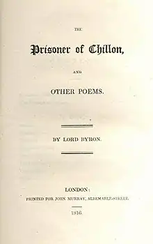 Because of torrential rainfall, Byron and his companion rested at a hotel in Ouchy following their tour. In late June or early July (several early drafts and copies present conflicting dates), Byron composed the longer fable.[1] The work was probably completed by 2 July 1816. The Prisoner of Chillon was first published as The Prisoner of Chillon and Other Poems by John Murray on 5 December 1816.