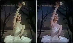 A main point of contention amongst both British and American critics was a perceived lack of realism concerning the ballet sequences.[57] The focus of this criticism was the film's central 17-minute ballet performance of The Ballet of the Red Shoes: Many dance critics felt the sequence's impressionistic touches—which include abstract hallucinations and visual manifestations of Vicky's mental state—detracted from the physical aspects of the ballet.[58] British ballet critic Katherine Sorley Walker also dismissed the sequence, commenting that it marked "a departure from the illusion of stage ballet to the limitless and lush spaces reflecting the ballerina's thought."[55] Eames made similar criticism, condemning the subjective elements of the sequence as "corrupting the integrity of the ballet," as well as the choreography.[59] Philip K. Scheuer of the Los Angeles Times, however, praised the presentation of ballet in the film, deeming it "the most ambitious—and probably the most dazzlingly successful—use of traditional-type ballet in any motion picture to date."[60]