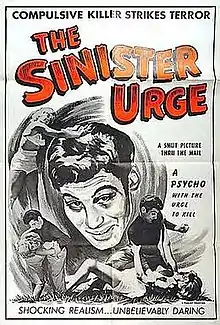 In 1959, Ed Wood completed a screenplay titled The Racket Queen. Producer Roy Reid of Headliner Productions was willing to fund the project, though Wood had to revise his script in early 1960. The result was The Sinister Urge, which was filmed primarily in July 1960.[2] The film project was influenced by a box office hit of the time, Psycho (June 1960) by Alfred Hitchcock. Both films were about sexually motivated psychopaths, and Reid and Wood likely aimed to capitalize on the similarity of their concepts.[2] Dino Fantini, who played the psycho killer in the film, said Ed Wood picked him for the role at an audition he and the other students participated in at the acting school they were enrolled at (he was only 18 at the time).[3]