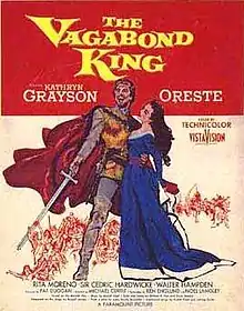 The Vagabond King is a 1956 American musical film directed by Michael Curtiz and starring Kathryn Grayson, Rita Moreno, Sir Cedric Hardwicke, Walter Hampden, Leslie Nielsen, and Maltese singer Oreste Kirkop in his only feature film role. It was produced and distributed by Paramount Pictures. It is an adaptation of the 1925 operetta The Vagabond King by Rudolf Friml. Hampden plays King Louis XI. Mary Grant designed the film's costumes.