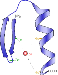 Designer zinc-finger proteins are engineered proteins used to target specific areas of DNA. These proteins capitalize on the DNA-binding capacity of natural zinc-finger domains to modulate specific target areas of the genome.[22] In both designer and natural zinc-finger motifs, the protein consists of two β-sheets and one α-helix. Two histidine residues on the α-helix and two cysteine residues on the β-sheets are bonded to a zinc atom, which serves to stabilize the protein domain as a whole. This stabilization particularly benefits the α-helix in its function as the DNA-recognition and -binding domain. Transcription factor TFIIIA is an example of a naturally-occurring protein with zinc-finger motifs.[23]