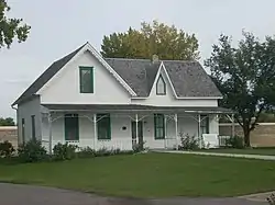 Built in 1879 for Thomas D. Campbell, the house consists of the original 1879 log cabin enclosed within a later Gothic Revival wood-frame addition, which is dated to ca. 1881–1900, with an overall L-shaped floor plan. The home has gabled roofs and clapboard siding. The main facade and south gables are distinguished by lace bargeboards, and the west gable contains a pointed window. A porch extends across the west facade and is supported by turned posts and bentwood arches. It is the only building remaining from the Campbell family's pioneer farmstead.