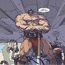 Croneman claims to be the mightiest barbarian of the northern tribes and honorary chief of the savage bezerkers of Nid. Known also as Amoron, the Wombat, he is a slayer, a reaver, a corsair, a usurper, and a conqueror.[28] Depicted as resembling Schwarzenegger, he is also a bodybuilder with a very silly accent.[29] On first meeting Croneman, Thrud slices him in half with a sword. When Croneman returns to join a group of mercenaries fighting The Black Currant in Thrud the Destroyer, he is depicted with a line of sutures running down the middle of his face and chest.