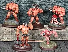A range of Thrud merchandise has been produced since the character's inception, including a Thrud T-shirt and badge[34] as well as a series of miniatures. Citadel Miniatures produced five different metal miniatures of Thrud, starting in 1984 with a "White Dwarf Personality" miniature.[35] Three numbered limited edition miniatures followed consisting of "LE12, Thrud the Barbarian", in 1986,[36] "LE19, Thrud and Female Admirer" in 1987,[37] and "LE104, Thrud scratching head".[38] Thrud was also introduced as a Blood Bowl player[39] and Jervis Johnson commissioned an appropriate miniature.[40] Heresy Miniatures has also produced three Thrud miniatures,[35] including a limited edition "Strolling Thrud" that sold out within three weeks of release.[41] On 29 March 2007,[42] another limited edition of 1000 resin miniatures was released.[43]