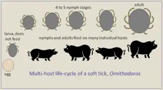 Argasidae soft ticks have different lifecycles from Ixodidae hard ticks, and these are very variable between species.[1] Typically, in Ornithodoros, a larva hatches from an egg laid in the nest or resting place of the host. The larva does not feed, but directly molts into the first nymph stage. This stage feeds, then molts into the next nymph stage. Feeding by soft ticks is generally completed within minutes rather than days, as with hard ticks. Depending on circumstances, four or five nymph stages occur, each progressively larger. Finally, a molt produces an adult female or male. The female takes repeated blood meals that are small compared to a female hard tick. Each blood meal is converted to a small batch of eggs. The male feeds sufficiently to support its mating. The lifecycle of Argas persicus is similar, but the larva feeds on blood of its bird host, remaining attached around 7 days.