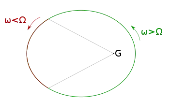 We now have a rule of thumb: Whenever angular velocity at a given moment of the orbit is less than the angular velocity of either body (ω<Ω) then the orbital torque tries to speed up the orbit. And vice versa.[1]