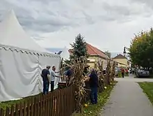 During the World War II Tovarnik was a part of Independent State of Croatia, a puppet state led by the fascist Ustaša organization which at the time ruled the entire Syrmia region and implemented genocide of Serbs on its territory. The historical Serb village of Ivanci, which was located south of Ilača, was completely destroyed on 30 November 1943 while 73 inhabitants were murdered in half an hour by Nazi German forces.[9] The village of Ivanci was center of the Yugoslav Partisans in Syrmia with established local branches of Women's Antifascist Front of Yugoslavia and League of Communist Youth of Yugoslavia.[9] Surviving villagers found rescue in Šidski Banovci, Tovarnik and Ilača.[9] After the Syrmian Front broke through on 12 April 1945 local Danube Swabians and some Croats in Tovarnik (51 in total) were exposed to a wave of executions of suspected collaborators who were executed by being pushed from the tower of the Church of St. George.[10] Protestant Danube Swabians from Šidski Banovci were expelled despite the fact that they helped to save survivors from Ivanci and were more protective of local Orthodox population than Catholic Danube Swabians.[9]