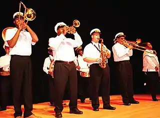 The Treme Brass Band is a marching brass band from New Orleans, Louisiana led by snare drummer Benny Jones Sr. The band, which plays traditional New Orleans-style brass band music, features a shifting lineup that has included trumpeters Kermit Ruffins and James Andrews, tenor saxophonists Elliot Callier and Frederick Sheppard, trombonist Corey Henry, and sousaphonist Kirk Joseph.[1] Prior to his passing in 2012, Lionel Batiste appeared consistently on the bass drum. They have released two albums, Gimme My Money Back on Arhoolie Records and I Got a Big, Fat Woman on the Sound of New Orleans Records label.[2] The band takes its name from New Orleans' Tremé neighborhood; due to some historical confusion, the "Treme" in the name is sometimes spelled "Tremè" or "Tremé". In 2010 the Treme Brass Band performed with Uncle Lionel Batiste to play Voodoo Experience in New Orleans.