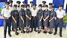 Male Officers in Grey Shirt and Dark Blue Pants, Female Officers in Dark Blue Tunic and Skirt