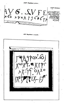 I turned south and climbed the remains of the temple of Friendship. I had barely reached the mound when I set foot upon a hard stone. The foreign characters under the Latin characters engraved on it made this monument so precious in my eyes, that I have not hesitated to include a copy of the inscription... It is a shame that it is only a fragment, because it could allow clarification of Punic or Phoenician writing, which is, I believe, that of this inscription, because lingua punica quidquid terraram est à Cyrene usque ad Gades occupavit... The stone is still on the spot: I have not urged the Americans to seize it, because it suits France better, if it is deemed worthy of adorning the Napoleon Museum.[6]