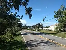Perhaps the legacy of Nestor, however, was the small tornado outbreak it caused across the Southeastern United States. Although Nestor was not classified as a tropical cyclone anymore at the time of its landfall, it spawned numerous supercells, which ultimately led to the spawning of several tornadoes. The National Weather Service (NWS) confirmed six tornadoes, one reaching EF2 status.[16] One of the tornadoes, only reaching EF0 status, was recorded in Seminole, Florida and damaged a mobile home park.[18] An EF2 tornado which tracked 9 miles also touched down in western Polk County, damaging over 50 homes and other buildings, including a middle school. The tornado also overturned an 18-wheeled vehicle which fell on top of a SUV, but no injuries were reported.[19] The next day, an EF1 tornado formed near Cape Coral in Lee County damaging several homes. No injuries or deaths were reported from any of the tornadoes.[20][21] An EF0 landspout tornado was sighted in Micco, but it caused no damage.[22] One other EF0 tornado was confirmed in Cordele, Georgia, downing trees, shifting a barn off it foundation, and ripping part of a metal roof off an industrial building.[23] Another EF0 tornado was confirmed on October 20 on the west side of Myrtle Beach, South Carolina, snapping and uprooting numerous trees, including fallen pine trees that damaged to two mobile homes.[24]