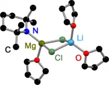 Knochel et al. proposed that LiCl increases the reactivity of Turbo-Grignard compounds RMgCl·LiCl (R = alkyl, aryl or vinyl) by giving the reactive bimetallic monomer a magnesiate character in sense of a solvent separated ion pair (SSIP) [Li(THF)4]+ [RMg(THF)Cl2]−.[1][11] In case of the above mentioned Turbo-Hauser bases where the alkyl group of a Grignard is replaced by an amido group (R = R'2N−) this hypothesis could not be confirmed because no SSIP [Li(THF)4]+ was detectable.