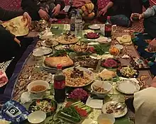 Pilaf (Turkmen: palaw, Russian: плов plov) is served at celebrations and to honored guests; one source calls it "king in Turkmen cuisine."[14] It consists of rice typically cooked with chunks of mutton and carrots, onions, and garlic, prepared in a large cast-iron cauldron. Different pilaf recipes may call for addition of raisins (Turkmen: kişmiş), fruits, fish, and ground meat.[3] Pilaf is traditionally eaten with the hands.