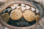 Meals are almost always served with naan, Central Asian flatbread, known locally as çörek. Turkmen bread is prepared differently from other breads in the region in thick, round disc-shaped loaves baked in a traditional tamdyr clay oven. Bread baked with meat inside (etli çörek, or "meat bread") can be consumed as a meal in itself. Ýagly çörek (literally "oily bread, buttery bread") is a flaky, layered type of flat bread made with butter. Pishme (Turkmen: pişme) are soft, bite-sized, sweetened, fried breads traditionally presented to arriving guests as a welcoming gesture.