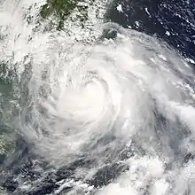 Typhoon Dujuan, known in the Philippines as Typhoon Onyok,[1] was the strongest tropical cyclone to strike the Pearl River delta since Typhoon Hope in 1979. The 13th storm and 7th typhoon of the 2003 Pacific typhoon season, Dujuan developed on August 27 to the east of Taiwan. It initially moved to the northwest, slowly intensifying into a tropical storm while drawing moisture and rainfall over the Philippines. On the island of Luzon, one person was killed and areas were flooded. Dujuan quickly intensified after turning and moving quicker to the west-northwest, developing an eye. It reached peak winds of 150 km/h (93 mph) on September 1, and shortly thereafter passed just south of Taiwan. There, Dujuan left 590,000 people without power, killed three, and caused NT$200 million (NWD, $115 million USD) in crop damage.[nb 1] While moving through the South China Sea, the typhoon developed concentric eyewalls. Dujuan weakened to severe tropical storm status before making landfall on September 2 in southern China, just east of Hong Kong near Shenzhen, Guangdong. The storm dissipated the next day after causing 40 deaths and ¥2.3 billion (CNY, US$277 million) in damage. Most of the deaths were in Shenzhen where the storm moved ashore, and the city experienced a near-total power outage.