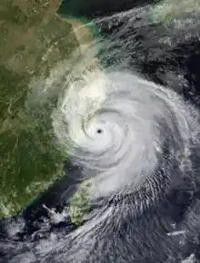 Typhoon Khanun, known in the Philippines as Typhoon Kiko, was the strongest tropical cyclone to make landfall on Zhejiang Province since Wanda in 1956. Khanun developed from an area of convection east-southeast of Yap on September 5, thereafter tracking northwestward. The precursor reached tropical storm status on September 7 and typhoon intensity the next day. The tropical cyclone reached its peak intensity on September 10 with winds estimated at 155 km/h (100 mph) and a minimum barometric pressure of 945 mbar (hPa; 27.91 inHg).[nb 1] After weakening slightly, Khanun moved ashore Zhejiang Province the next day, weakening further as it tracked over land. After recurving into the Yellow Sea on September 12, Khanun became extratropical; these remnants continued to track into the open North Pacific before they were last noted on September 16.[1][nb 2][nb 3]